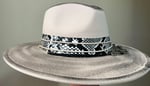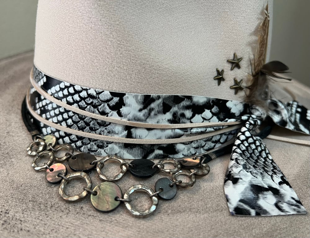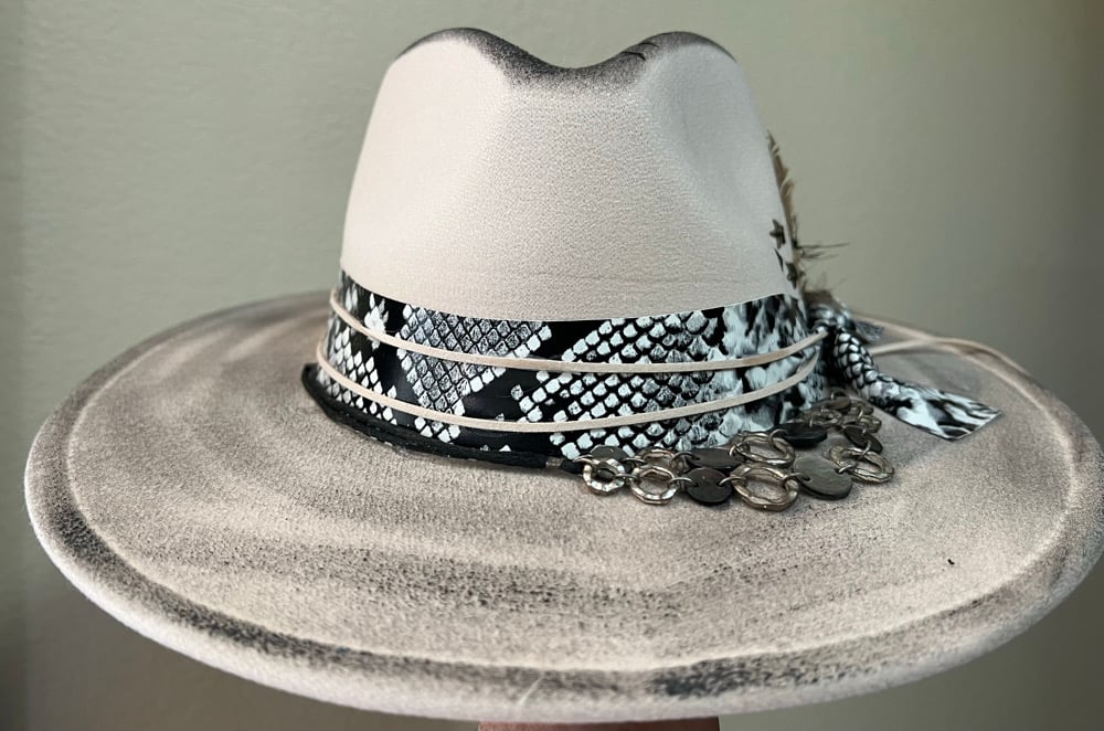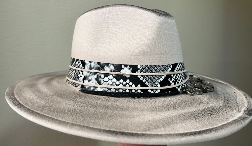 An off-white, black painted fedora style hat. A snakeskin and chain band with feathers on the side. Adjustable. All hats are handmade and one of a kind.