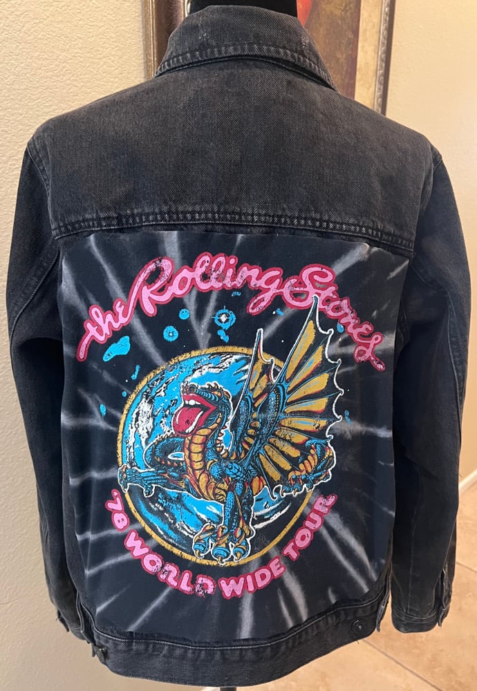 A vintage black denim jean jacket. A Vintage Rolling Stone concert T-shirt is on the back. Side pockets. Button down front. Size M.