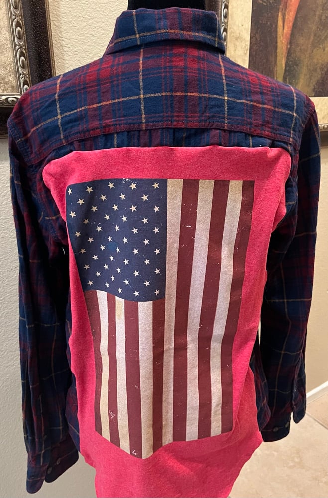 A vintage blue, red, and yellow men's flannel shirt. An American Flag t shirt is on the back. Size S.