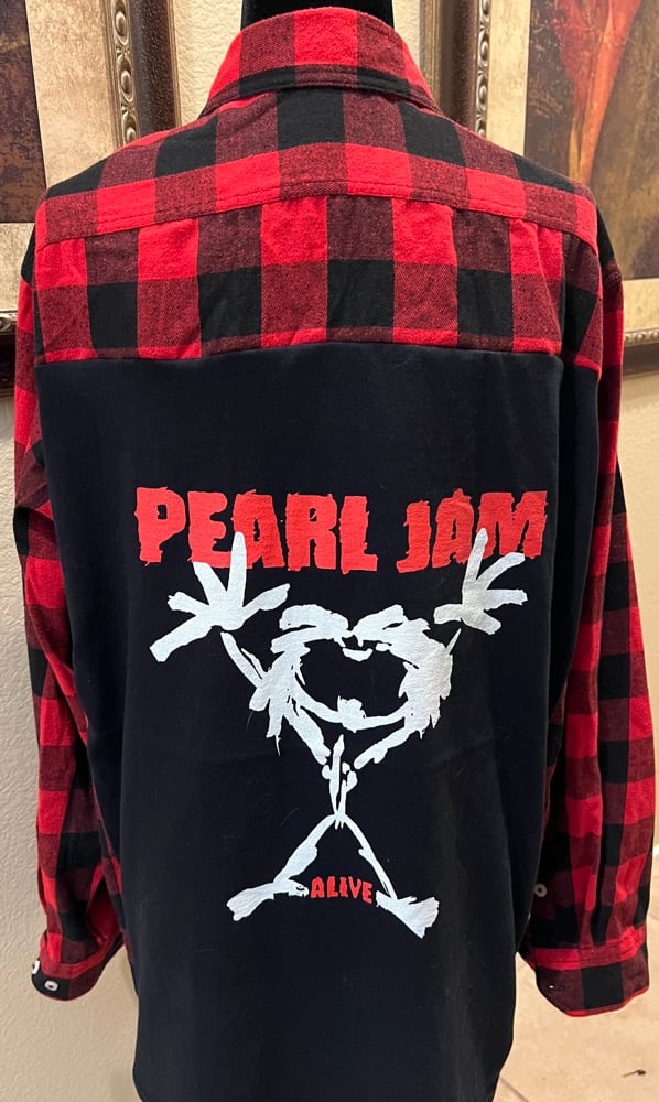 A vintage red and black men’s flannel shirt. A Pearl Jam concert t-shirt on the back. Size 2XL.