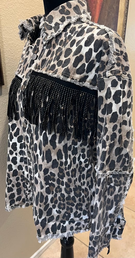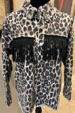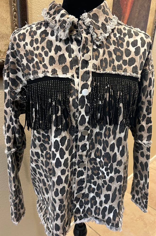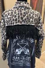 A vintage leopard print denim jacket with black fringe on the front and back. A vintage Johnny Cash t-shirt is on the back. Size S/M.