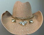 A crushable beige cowboy hat. Hat has a gold chain and crystal bee band. Sequins on hat. Adjustable. All hats are handmade and one of a kind.