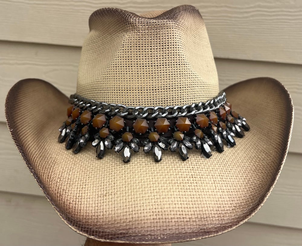 A 2 tone beige and brown cowboy hat. Hat has a brown and gunsmoke stone band. All hats are handmade and one of a kind.