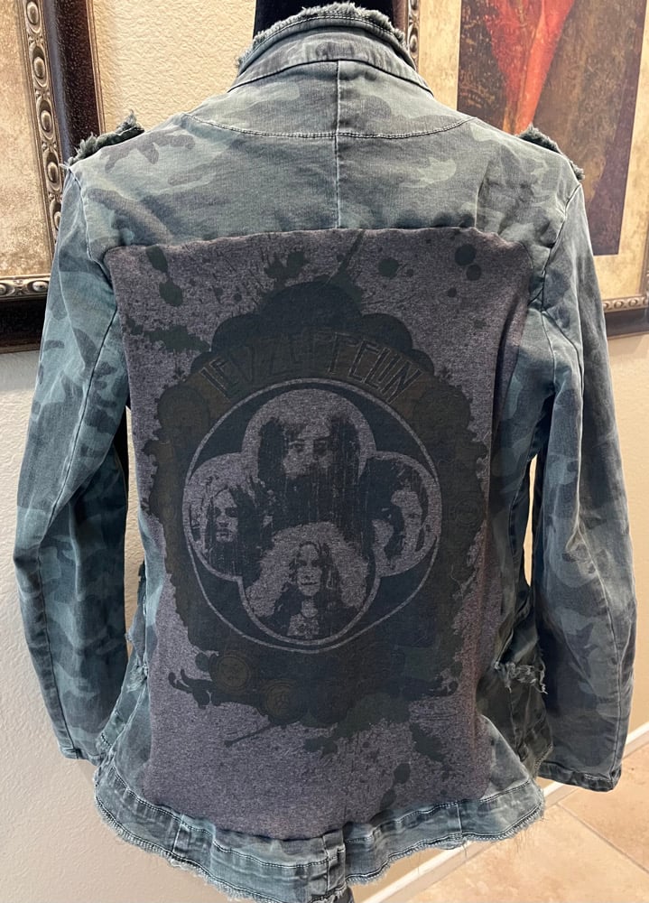 A vintage green camo print jean jacket. A vintage Led Zeppelin T-shirt is on the back. Size S.