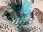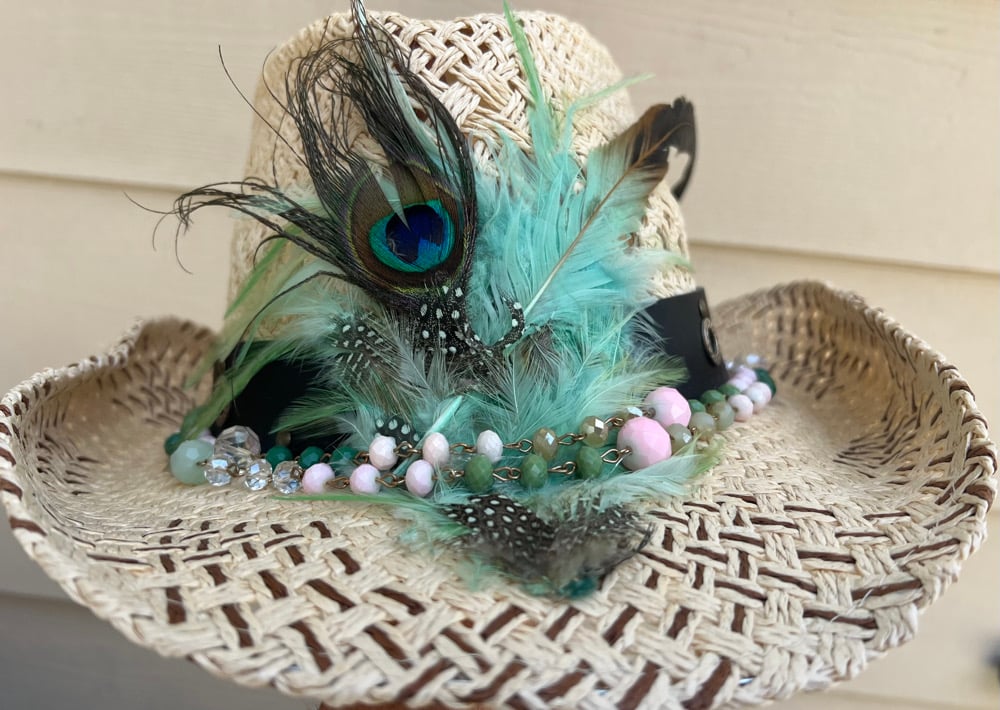 A cream open weaved cowboy hat. Hat has green and peacock feathers and a pink and green bead band. Hat is adjustable. All cowboy hats are 1 of a kind.