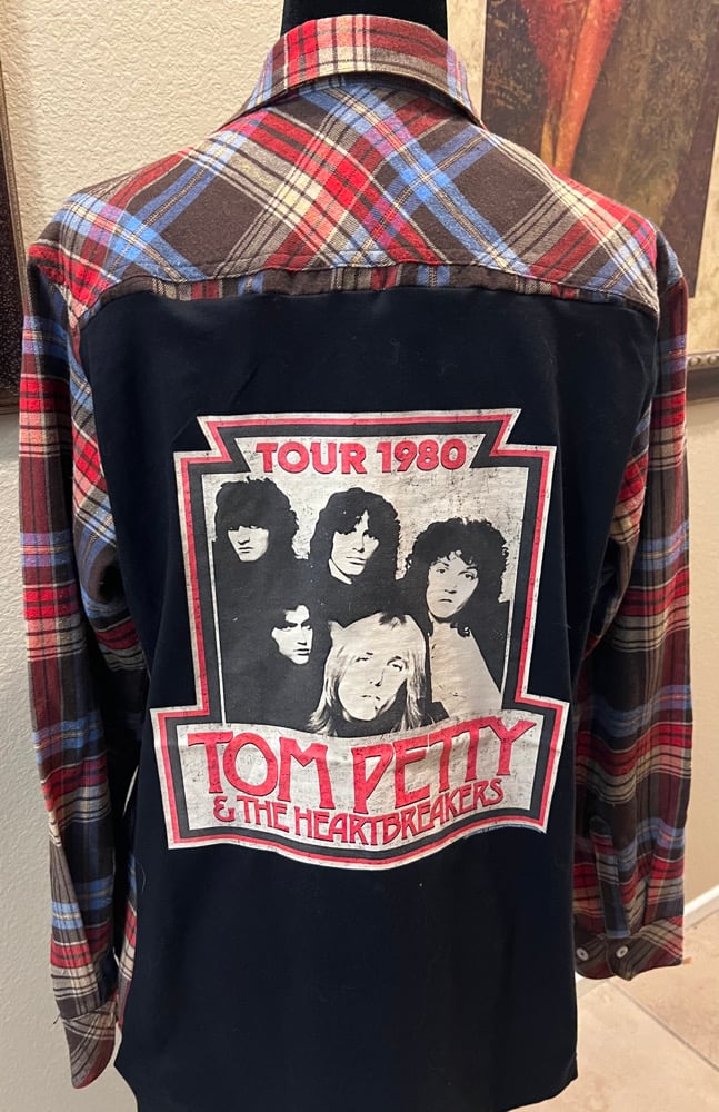 A vintage blue, brown, cream and red men's flannel shirt. A vintage Tom Petty t-shirt is on the back. Size L.