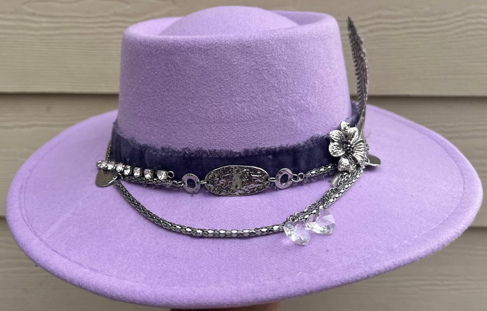 A lavender colored bolero hat. Layered silver band with feathers on the side. All hats are handmade and one-of-a-kind.