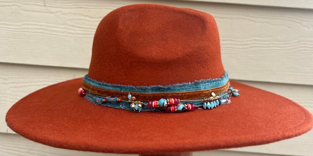 An orange fedora hat. Layered bead band with feathers on the side. All hats are handmade and one-of-a-kind.