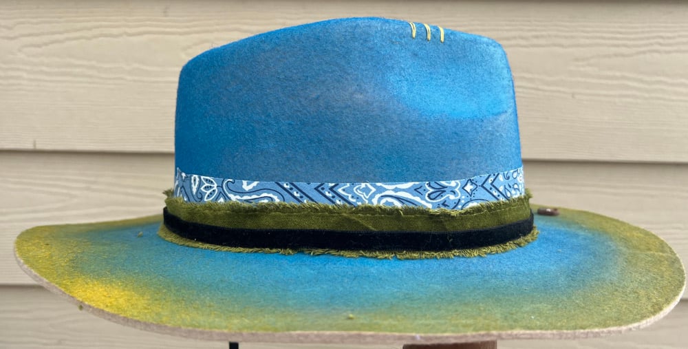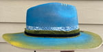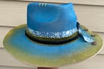 A handmade, painted blue and green fedora hat. Layered band. A crystal blue butterfly and feathers on the side. Adjustable. All hats are handmade and one-of-a-kind.