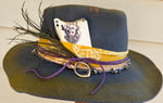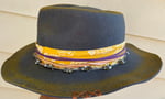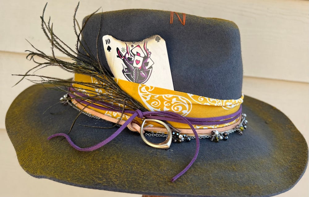 Handmade Torch Burned Yellow/Gray Fedora Hat, Playing Card, Bead & Feather Band