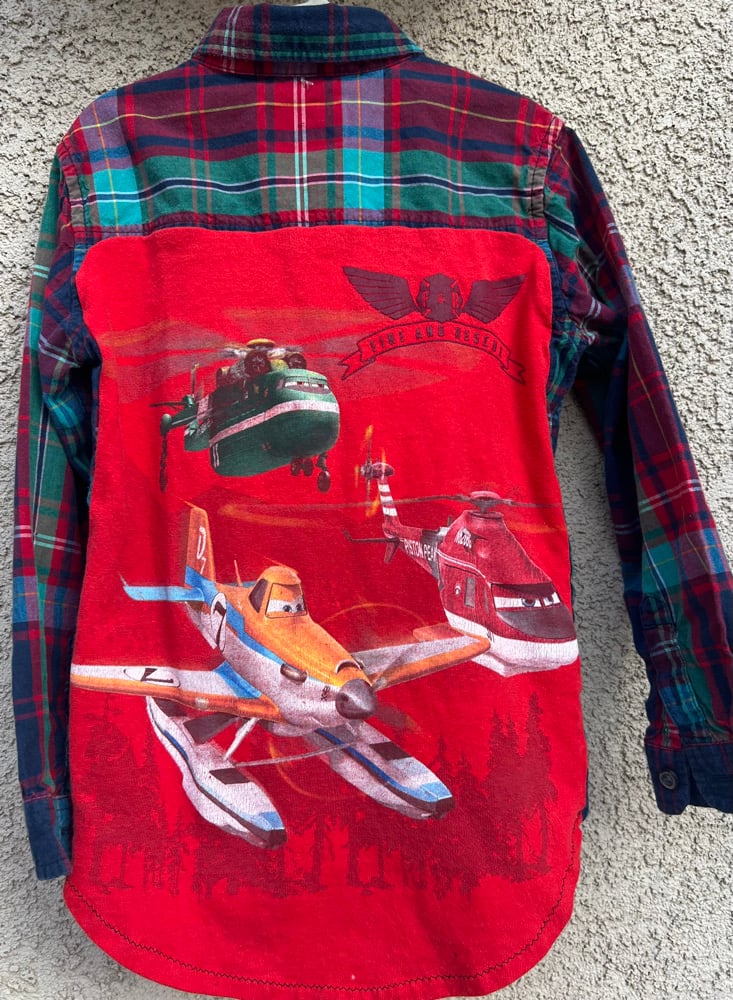 A vintage blue, red and green cotton shirt. A vintage Disney Airplanes t-shirt is on the back. Size 5.