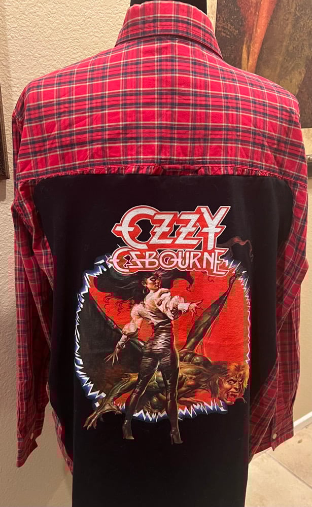 A vintage, red, black and cream men's cotton shirt. An Ozzy Osbourne concert T-shirt is on the back. Size L.