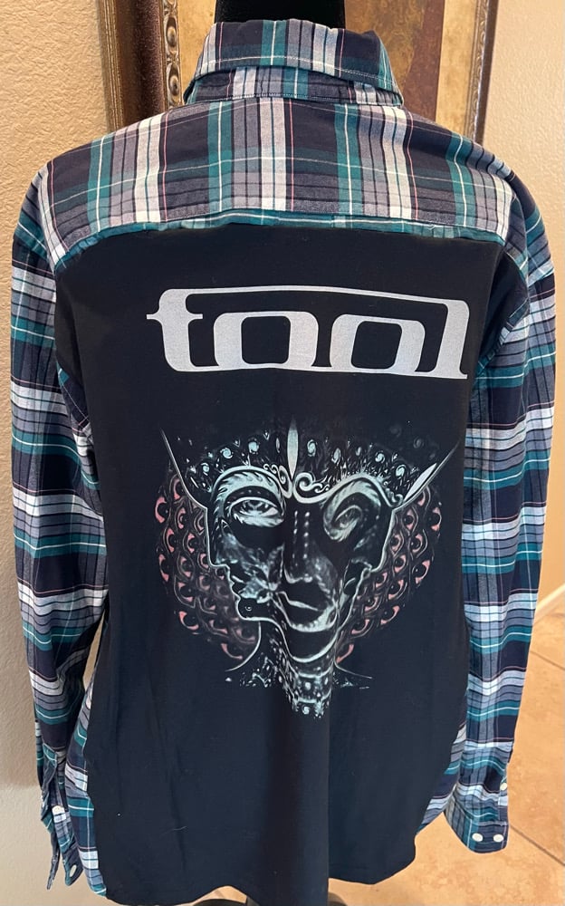 A vintage blue, gray and white men’s flannel shirt. A vintage Tool concert T-shirt is on the back. Size XL.