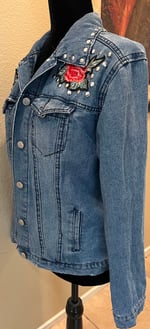 A vintage blue denim jean jacket. Side Pockets. Studs on collar and front. embroidered roses on the front. A vintage Guns N’ Roses concert T-shirt is on the back. Size L.