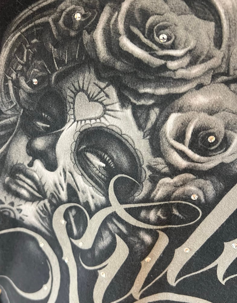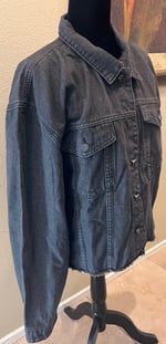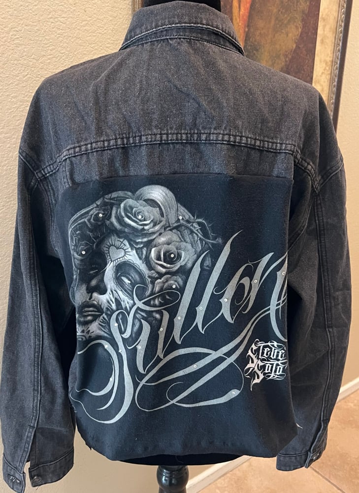 A vintage black denim jean jacket. A vintage Sullen Girl t-shirt is on the back. Crystal on shirt. Raw edge. Side Pockets. Size XL.