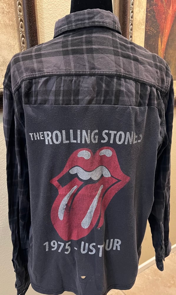 A vintage black and gray men’s flannel shirt. A vintage Rolling Stones concert T-shirt is on the back. Bottom of shirt has a couple holes as pictured. Size L.