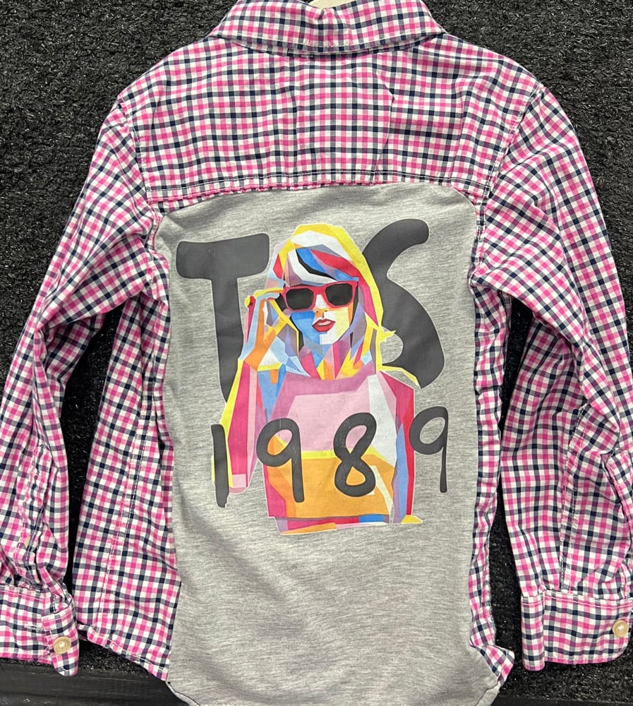 A children's vintage, pink, black and white cotton shirt. A Taylor Swift T-shirt is on the back. Size 6.
