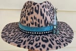 A leopard print fedora hat. Hat has a velvet layered band with feathers and crystals on the side. All hats are 1 of a kind.