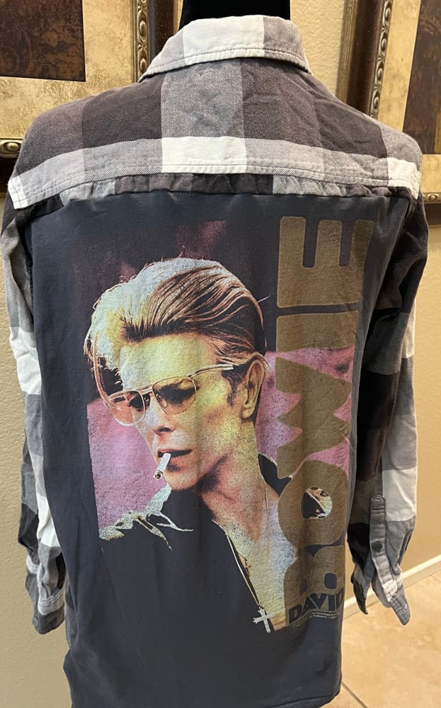 A vintage gray and white men’s flannel shirt. A vintage David Bowie T-shirt is on the back. Size L.