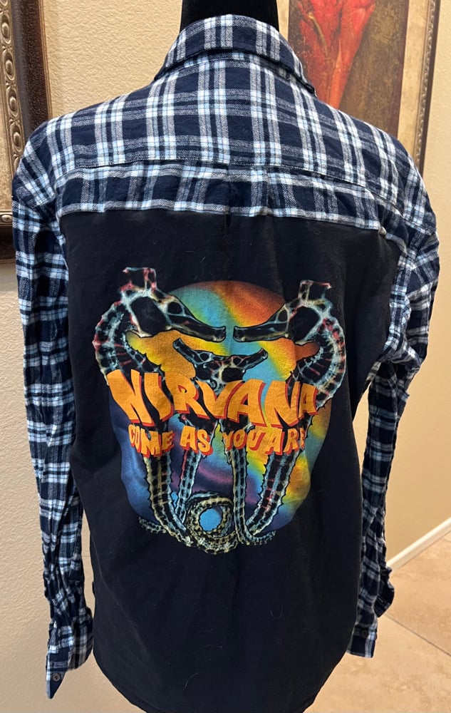 A vintage blue and white mens flannel shirt. A vintage Nirvana concert T-shirt is on the back. Size L.