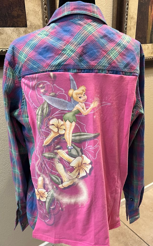A vintage blue, pink and green, men's flannel shirt. A vintage Tinker Bell t-shirt is on the back. Size L.